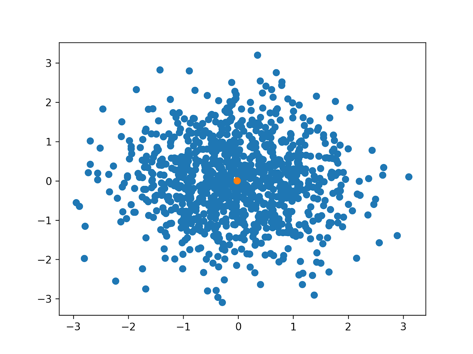 Looks pretty Gaussian. I tried this with multiple centers and got a mess, so I ended up doing something a little more ugly to create a multi dimensional dataset with multiple centers.
